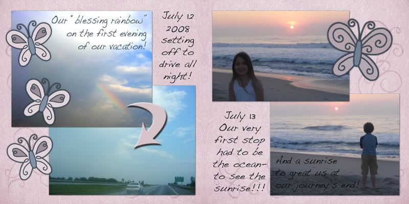 I'd done a couple single pages from the summer vacation 2008, but I hadn't started doing the double pages for an album. So, here's the "first set" showing the night we left out driving and the morning at the coast. (I just noticed a typo that I'll need to fix!)